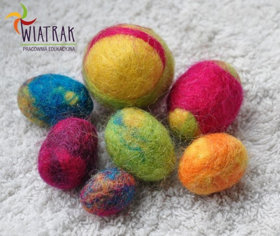 Obserwując budzącą się do życia przyrodę, wypatrując pierwszych kwiatków i nasłuchując świergotu ptaków, tworzymy kolorowe symbole życia – filcowe jajka. Jeśli Wasze dzieci chcą spróbować swoich sił w filcowaniu na mokro, zapraszamy w najbliższą sobotę na warsztaty do WIATRAKA.
